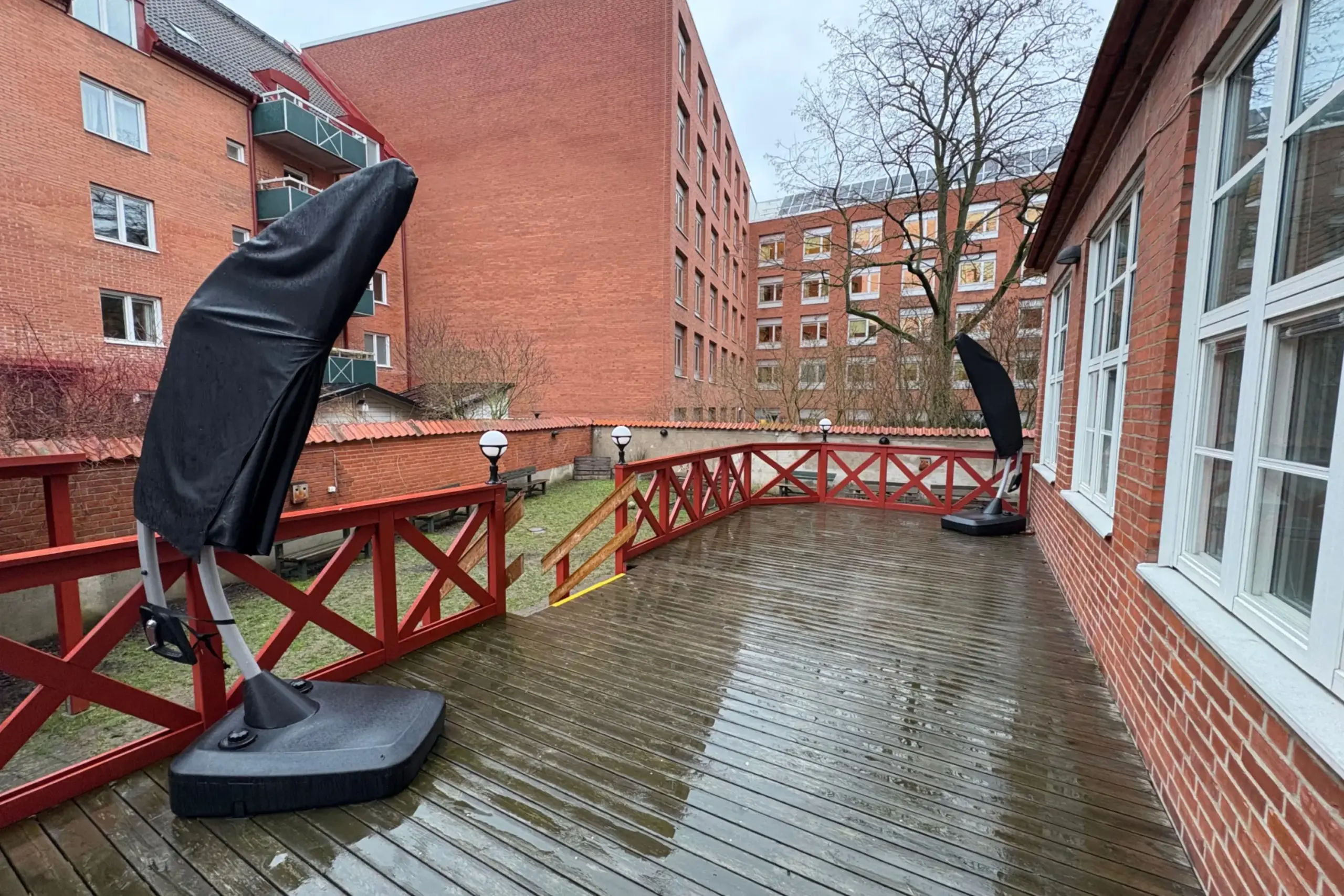 Vår lokal har en altan och uteplats som är perfekta för att umgås med dina gäster. Under vår- och sommarsäsongen finns utemöbler tillgängliga. Du har också tillgång till en liten innergård som passar utmärkt för mindre grupper eller en paus utomhus.