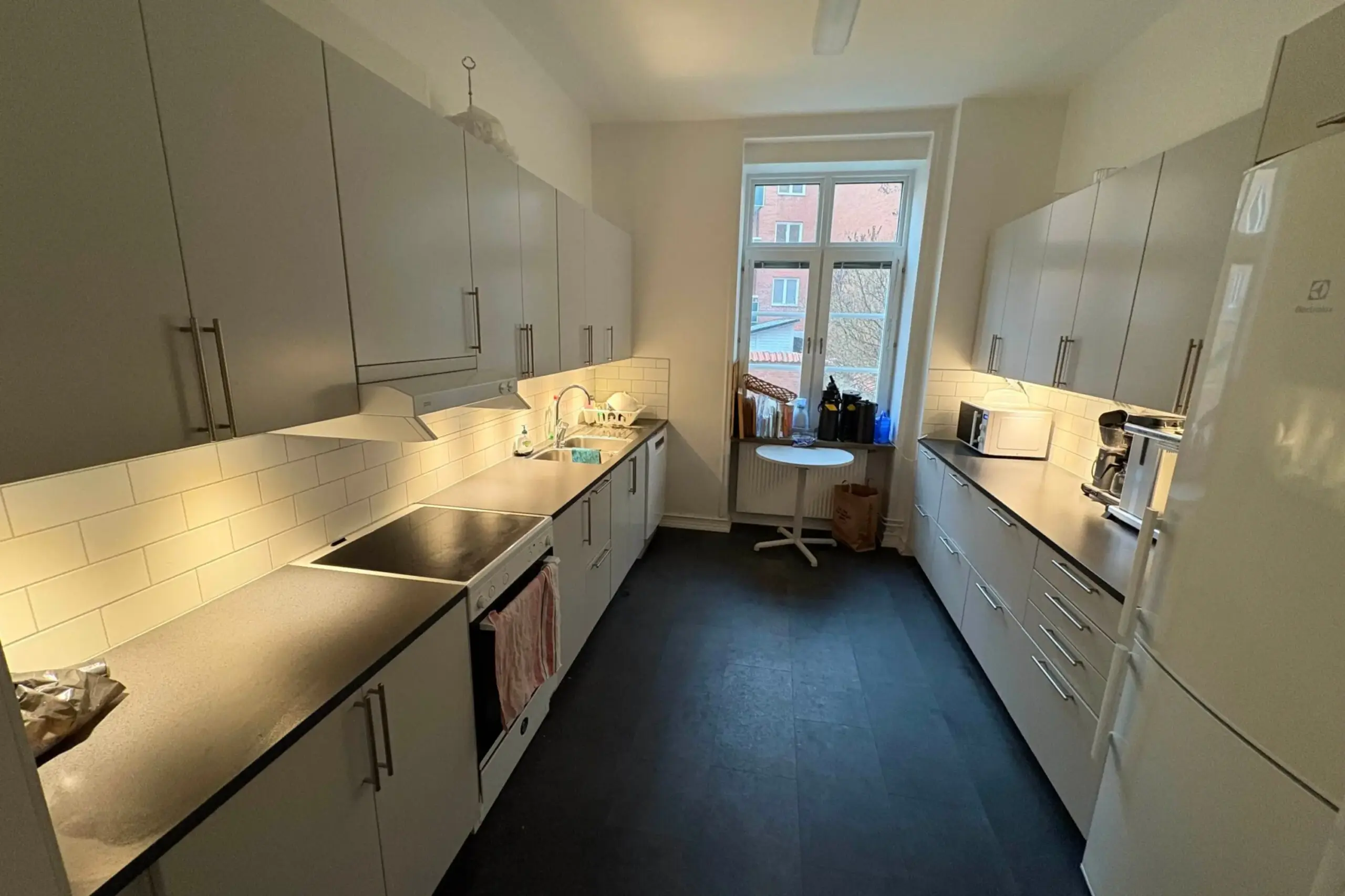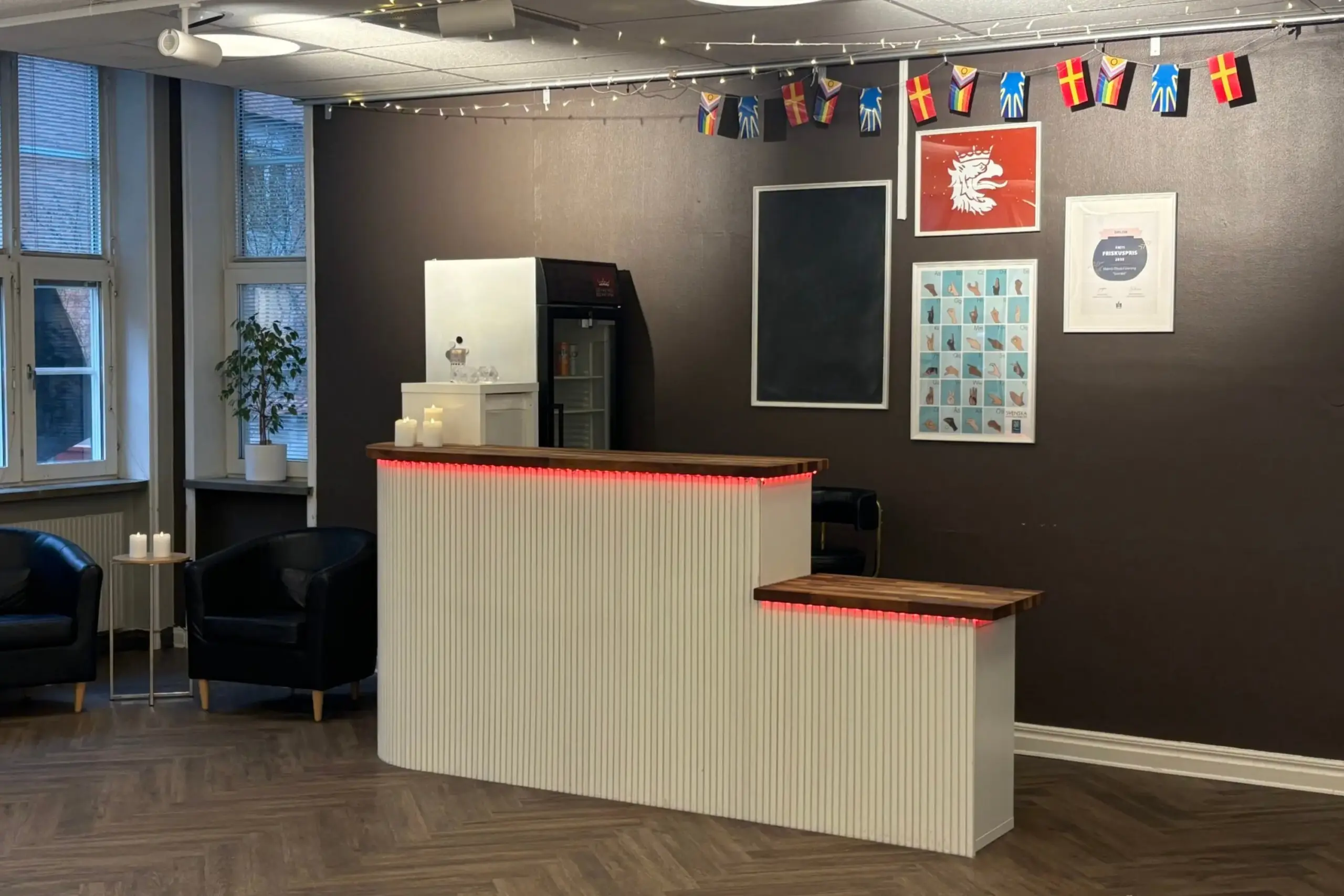 I lokalen finns en bardisk och ett extra kylskåp som du kan använda för att förvara mat och dryck till dina gäster. Bardisken är ett unikt inslag, handgjord av våra medlemmar, och bidrar med både funktionalitet och charm till lokalen.